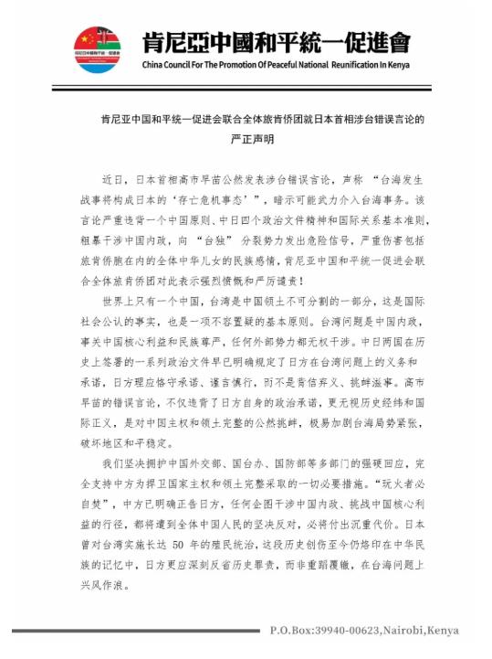 肯尼亚中国和平统一促进会联合全体旅肯侨团就日本首相涉台错误言论的严... 2025-11-17